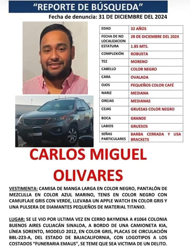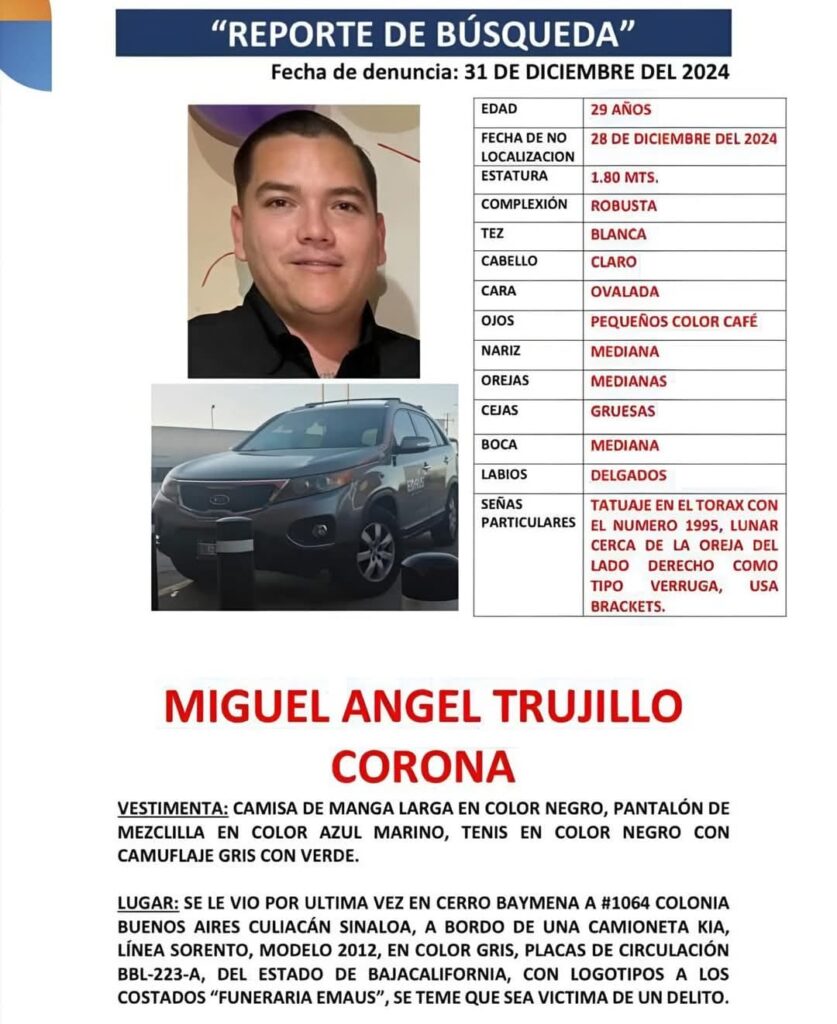 La Fiscalía General del Estado de Culiacán, emitió fichas de búsqueda para Carlos Miguel Olivares de 32 años, y Miguel Ángel Trujillo Corona de 29, quienes fueron vistos por última vez el 28 de diciembre del 2024, en el domicilio ubicado en Cerro Baymena #1064, colonia Buenos Aires, mientras se encontraban a bordo de una camioneta Kia Sorento modelo 2012, color gris, con placas de Baja California y logotipos de la funeraria en los costados.