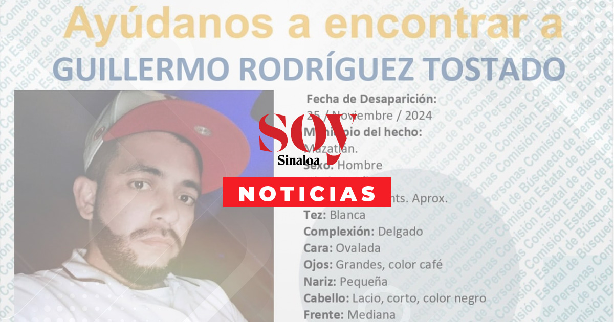 Guillermo Rodríguez Tostado de 37 años, desapareció el 25 de noviembre de 2024, en la colonia Libertad, Mazatlán, Sin., visto por última vez a las 23:40 hrs, sin tener noticias sobre su paradero.