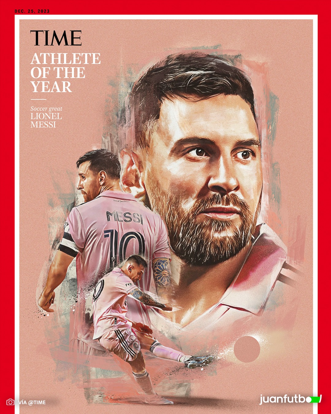El artículo que Time le dedica aparece ilustrado con varias fotografías en las que el astro aparece vestido con el uniforme rosa del Inter de Miami, ninguna de ellas muestra a Messi con la camiseta de la Selección Argentina, el club al que llegó en julio de este año y en el que ya ha empezado a cosechar títulos.