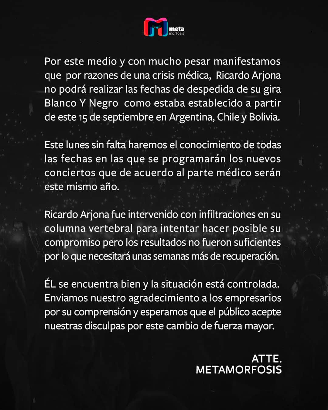 Por este medio y con mucho pesar manifestamos que, por razones de una crisis médica, Ricardo Arjona no podrá realizar las fechas de despedida de su gira